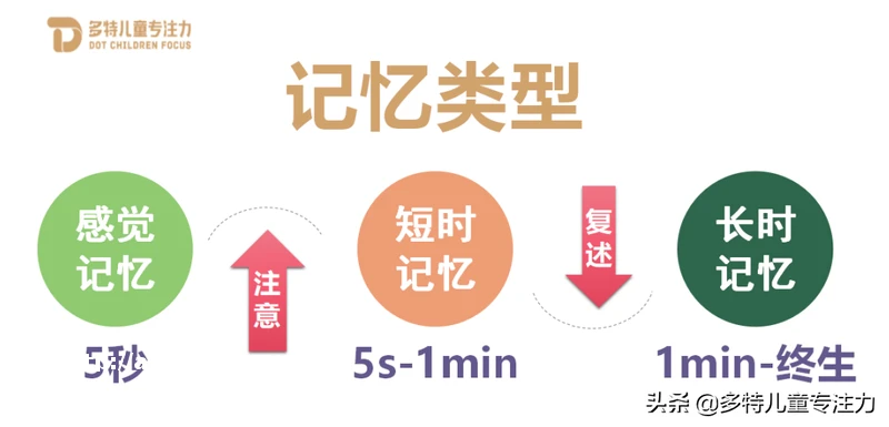 这是什么意思呢?孩子上课时,通过视觉和听觉进行感觉记忆,当孩子注意力集中时,就可以将这感觉记忆转为短时记忆,课后对知识点再进行梳理复述,就能转为长时记忆,更久地记住知识点。