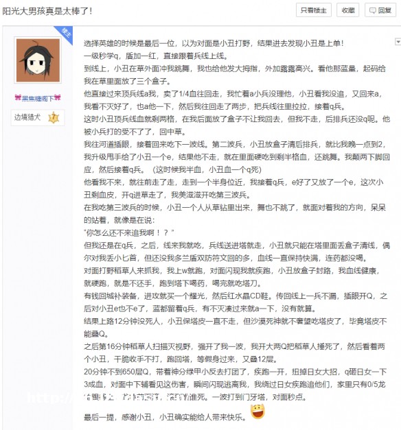 这篇帖子从狗头吧被转到了“正统”的抗压吧里,也“温暖”了许多抗吧老哥的心,在这篇体验谈的字里行间中,你很难感受到他只能Q兵发育的无力,面对一个残血的小丑却要忍住不能上头的烦躁等等负面情感。