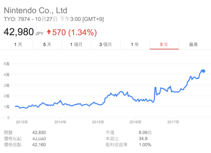 最近几个月,任天堂与中国市场的联系愈发紧密,《华尔街日报》认为,任天堂正在寻求更多的机会进军中国市场。在《Arena of Valor》宣布登陆 Switch 之后,任天堂的**来到了近五年来的历史高点。