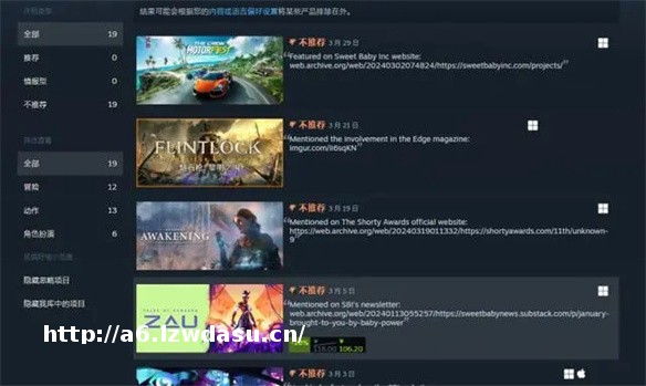 有个名叫“Kabrutusrambo”的玩家在steam创建了一个名叫“Sweet Baby Inc detected”的专题页,专门收集汇总了有sweet baby组织参与的游戏,以供玩家避坑。