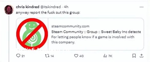 但好在,Chris Kindred这种行径最终不仅没得逞,还被广大的外国老哥们疯狂问候到封号7天,最后只得删推**,而接下来,又是经典的搬起石头砸自己的脚的戏码。本来Sweet Baby Inc detected这一鉴赏家专题在创建之初,结果因为这个名字可以被缩写为S和 B的组织又是带节奏,又是人身攻击的跳脚,仅用一周,