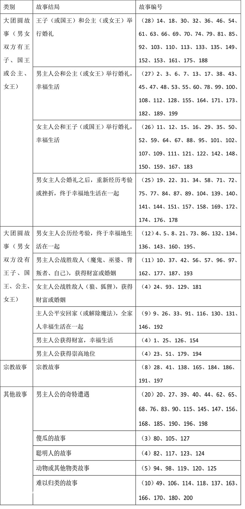 涉及王子(国王)或公主(女王)婚礼的故事,占比达到53%;非王室主人公获得财富、婚姻或全家团圆的故事,占比18%。美满婚姻和家庭的故事总占比达到71%。如果我们剔除4%的宗教故事,未涉及大团圆结*的其他故事只占21%。如果我们把获得财富和地位也视为大团圆一种变体,那么,在全部的200则童话中,大团圆故事的总占比高达75%,这还不包括动物故事中的团圆故事。