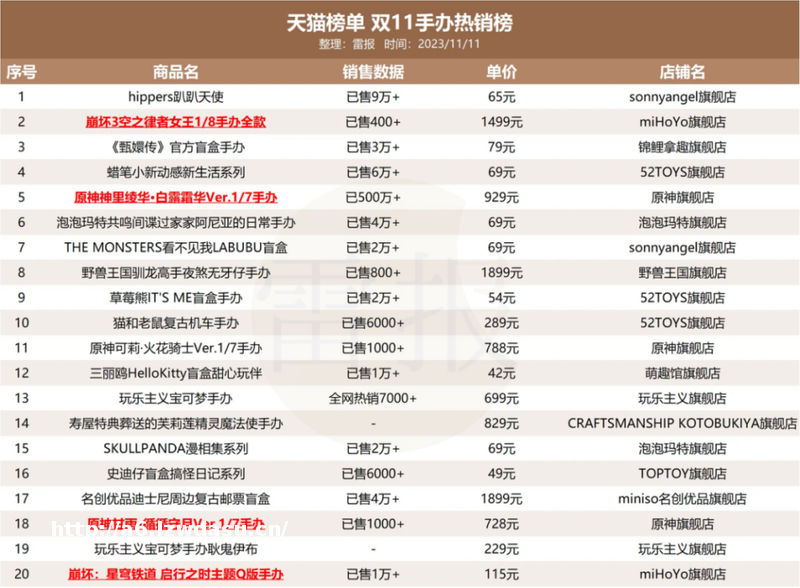 9月11日16时最新更新的天猫“双11手办热销榜”中,崩坏3、原神、崩铁等米哈游旗下大热二游IP手办产品同样突出重围,单品销售额轻松破百万。