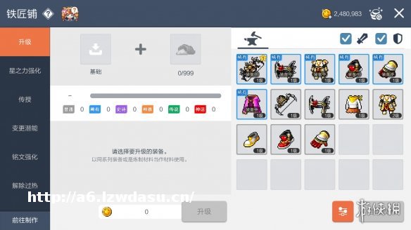 在铁匠铺中,玩家可以给装备升级、强化,还能够更改装备的潜能,以及给装备刻上铭文。