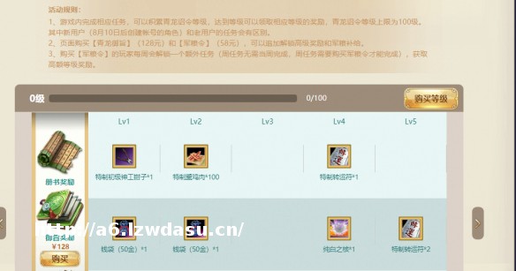 版本更新后,将开放新一期的青龙诏令,即可提升青龙诏令等级,达到一定等级后可以领取相应的奖励。青龙诏令等级上限为100级,新玩家(9月15日后创建帐号的角色)的战令任务相较老玩家会更加简单。玩家还可在活动页面购买【青龙御旨】(128元)和【军粮令】(58元),解锁更高级奖励和军粮补给!