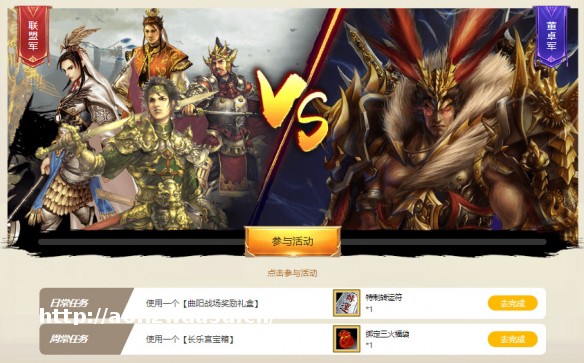 本次【远征战场】活动共分为两期,每期活动持续时长为一周。在活动页面点击参加活动,玩家将会随机加盟军或是董卓军一方。可获得任务奖励和【阵营积分】,当期活动结束后,积分高的阵营将赢得胜利。胜利方的玩家拥有开启两次【战场宝箱】的机会,失败方的玩家仅可开启一次【战场宝箱】。开启宝箱,在这场远征中,努力为自己的阵营夺得胜利的旗帜吧!