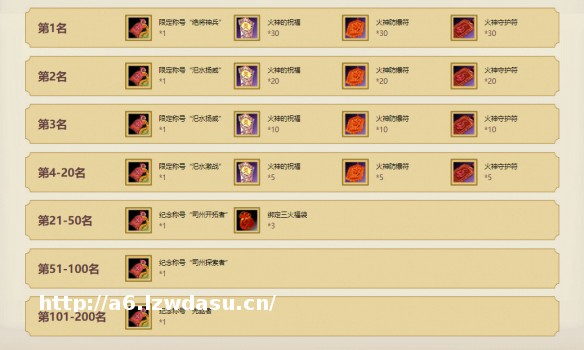 活动时间结束后,所有在冲级排行榜上的玩家们都可以获得特殊称号以及“三火”等道具奖励。排名二、三名的玩家可获得限定称号“汜水扬威”,排名**的玩家还将获得版本限定称号【绝将神兵】,成就非凡传说!