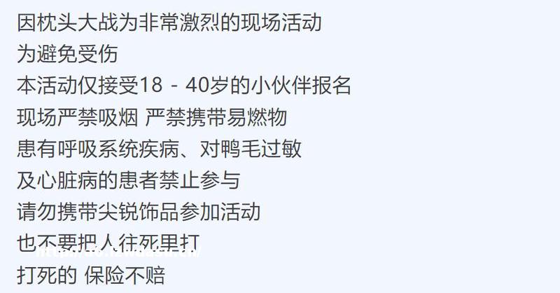 哪怕是活动过程中略感不悦的小缺陷,比如鸭毛枕头打起来实在不痛快,也再难继续抱怨,甚至有人还会觉得主办方体贴:“这样更方便打出鸭毛”。