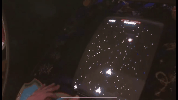在一个大厅里,很多人簇拥着一些机器。每个机器上有一块屏幕,上面是太空大战的场面。