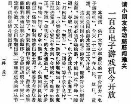 1981年10月18日,《解放日报》上**次提到了出现在上海的“电动游戏机”。当时,市工人文化宫举办了“饶有趣味又启发人们智慧的展览”。
