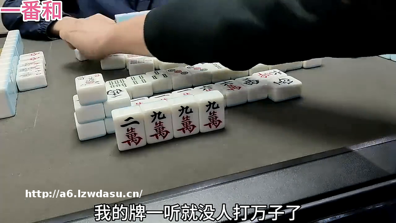 ·抓花,毫无关系,我的牌一听就没人打万子了,在他们不听牌之前应该很少看到万子了,有人来竞争了。对家一张万子没打,搞不好也是听在万子里,会不会是69万?对家打9万我的牌长大了,不过好像长大对我来说也没什么意义,去怎么多一横,要是个2万就开心快乐了。
