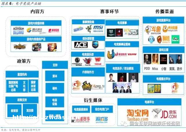 衍生媒体和电商平台:随着电竞参与者和观众群体的扩张,出现了很多专业电竞媒体,门户网站也纷纷开设电竞频道,还出现了电竞专属的社交应用。阿里、京东等电商平台上存在大量的电竞相关产品和衍生品,阿里旗下的阿里体育还积***电竞领域。