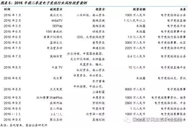 风险**和产业资本的介入,为电竞产业输送了源源不断的**。2016年前三季度,中国电竞产业至少出现了16起规模1000万元以上的风险**案例,几乎涵盖了整个电竞产业链。