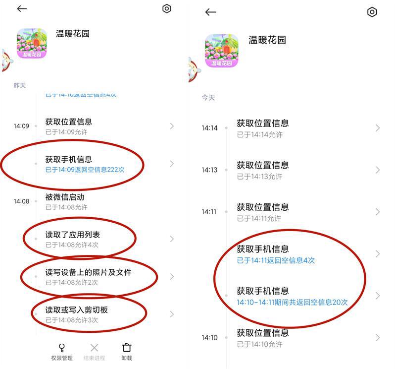 该软件安装**后就读取了应用列表、读取了手机中的照片及文件、读取或写入剪切板,随后还获取了位置信息。在不到1分钟的时间内,获取手机信息,返回空信息222次(手机设置的**权限,授予应用权限但返回空信息)。此外,该软件在后台还要求获取位置信息,不过该次请求被拒绝。