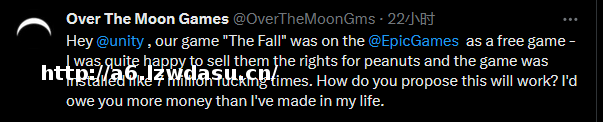 翻译:嘿@unity, 我们的游戏“The Fall”以前在@EpicGames上作为免费游戏,我当时很高兴以小价钱就卖给了他们这份权利,结果这个游戏被安装了大约700万次。你觉得这次的收费政策会怎么运作?我欠你的钱比我一生*的还要多。