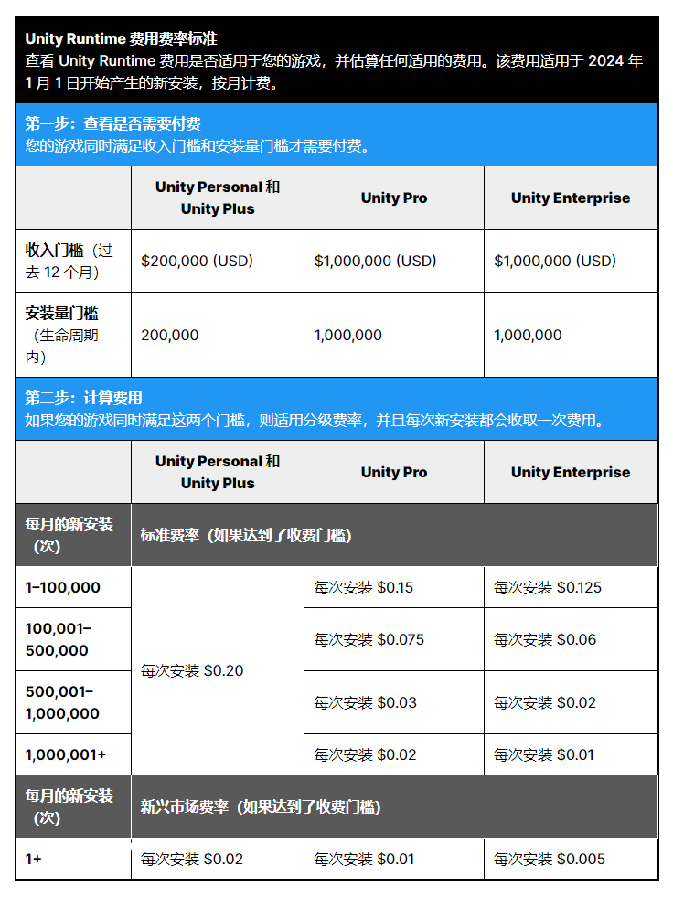 不过,Unity的新CEO对盈利有着远超常人的执着(这位CEO曾经的创举包括:试图在《战地》里对玩家征收**使用费),他们在10月17日公布的新收费标准震惊了整个业界,在2023年9月3日后,Unity将会按照新的标准进行收费,新标准分为几档,