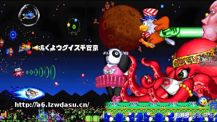 还是因为这款游戏依然是以《宇宙巡航机》作为基本架构,再配合上《沙罗曼蛇》拾取胶囊升级火力的玩法,还混搭进能弹出铃铛的射击游戏《兵蜂》的套路。