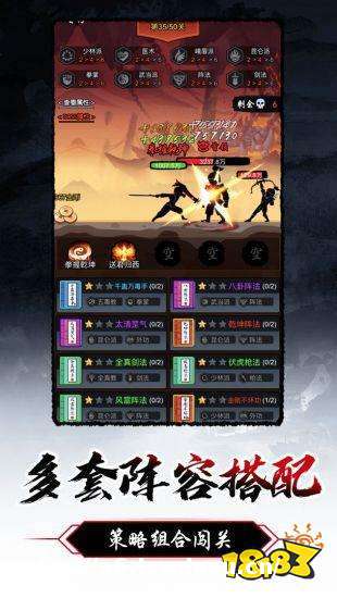 这是一款融入***元素的水墨武侠风格策略闯关游戏,过关需要合理搭配武功阵容。共64种不同的武功,各自拥有**的门派和职业属*。14种门派羁绊,10种职业羁绊,每种武功升到满星还可激活专有**,可搭配出多种各具特色的武功阵容。30种不同的侠客角色,每个侠客都有擅长的天赋技能。