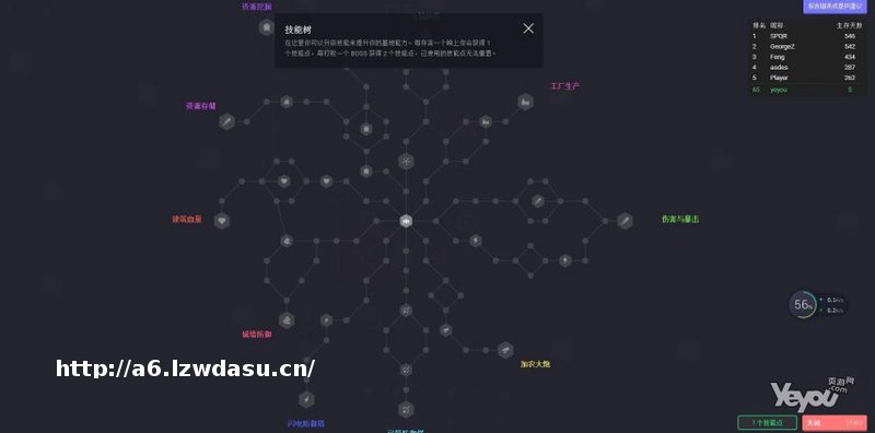 游戏有技能树系统,玩家可以通过点亮技能树来提升能力,包括建筑血量,存储资源的能力,城墙防御能力,工厂生产能力,防御塔能力等等