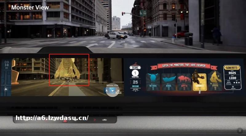 索尼也应用了游戏中的技术,采用Epic Games的虚幻引擎,构建了3D世界,前面的大屏幕将物理环境中的元素转换为实时3D对象,通过3D映射技术来创造有趣的视觉效果,比如屏幕中将障碍物化身为哥斯拉,与现实世界融合,从副驾看,就像踏入游戏世界。