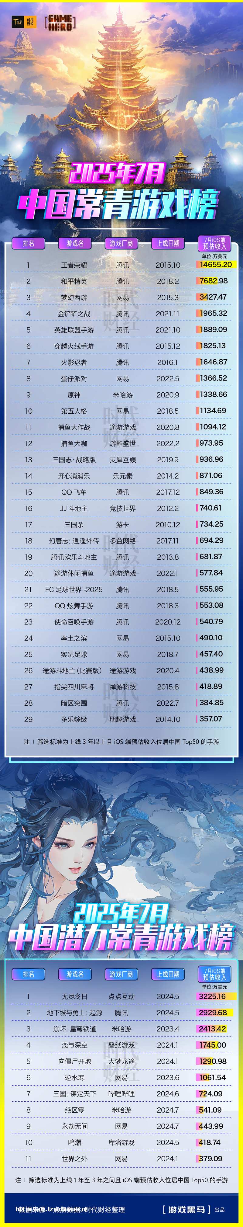 时代财经以上线3年以上且iOS端预估收入跻身中国地区Top50为筛选标准,统计并发布《2025年9月中国常青游戏榜》(下称“《常青榜》”);同时以上线1年至3年且iOS端预估收入跻身中国地区Top50为标准,统计并发布《2025年12月中国潜力常青游戏榜》(下称“《潜力常青榜》”)。