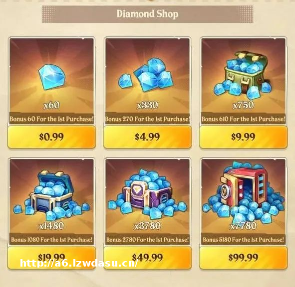 其多以0.99美元、4.99美元和9.99美元的低价套餐吸引微氪用户尝鲜(主推9.99美元750钻,利润为24%),99美元1480钻石,其利润仅为22%,49.99美元和99.