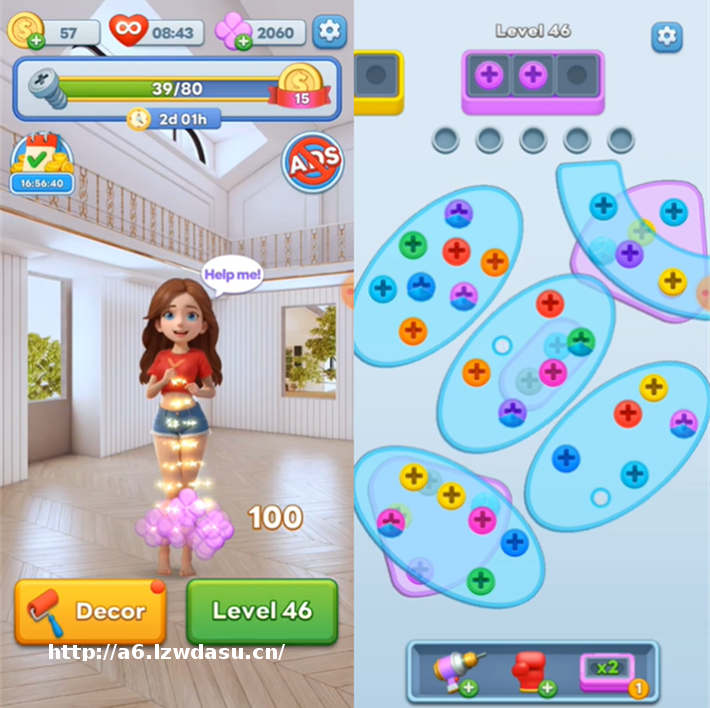 每个关卡会提供一个3D物体,要求玩家拧开物体上层层叠叠的螺丝,将不同颜色的螺丝一次放入对应槽位中。