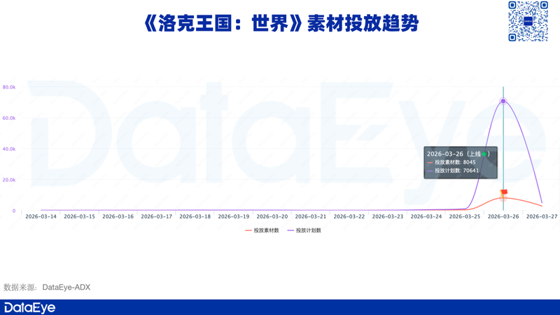 《洛克王国:世界》长期以来都有进行小幅度素材投放,但上线当天,迎来投放高峰期,单日素材投放量超8000组。