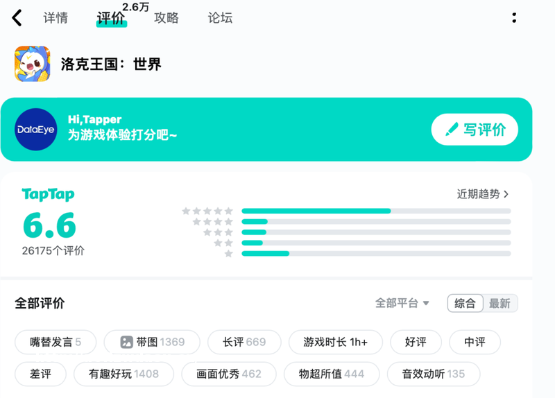 用户口碑方面,截至2月29日,《洛克王国:世界》TapTap评分为6.6分,6万条,