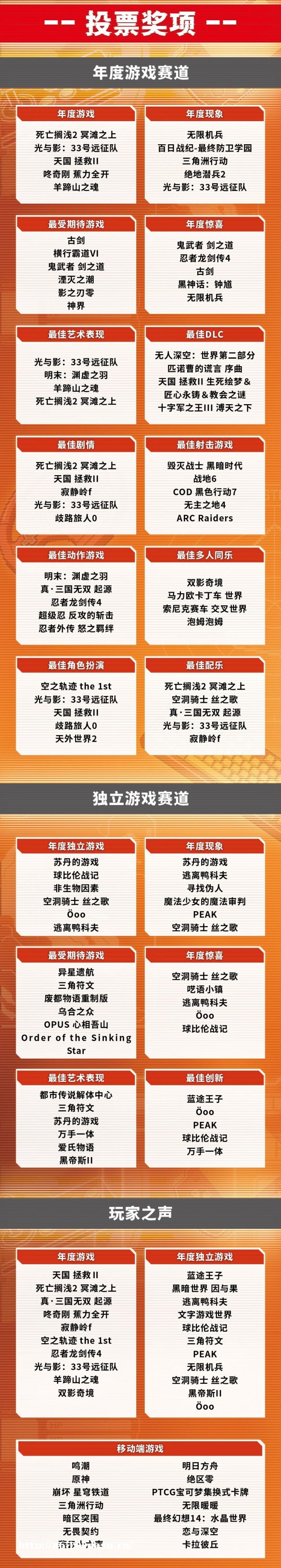 年度**游戏:《蓝途王子》《黑暗世界 因与果》《逃离鸭科夫》《文字游戏世界》《球比伦战记》《三角符文》《PEAK》《无限机兵》《空洞骑士 丝之歌》《黑帝斯 II》