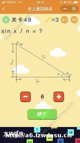正确答案是6.其实这个关卡有点类似脑筋急转弯,你如果按照正常的思路来通关的话,是很难过关的。我们可以把/这个符号当成是一个分行的,然后就可以约分了,把两个未知数都约掉,就只剩下six...也就是6了!