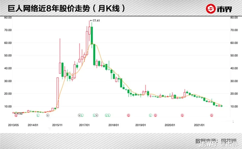 过去一年,巨人**几乎腰斩。高点每股19元,如今每股徘徊在10元附近。