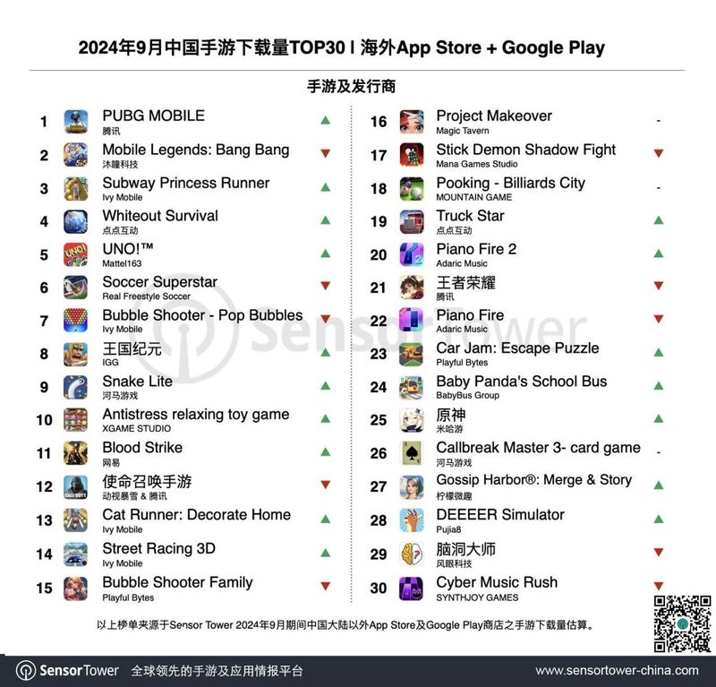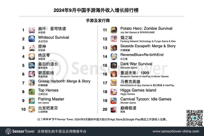 随着10月29日1.1下半卡池中限定S级人“简”的登场,以及10月27日全新1.2版本“火狱骑行”和限定S级人“凯撒”的上线,《绝区零》分别迎来两波收入高峰,该游戏9月海外收入环比提升20%,排名前进6位至收入榜第6名,并位列增长榜第4名。