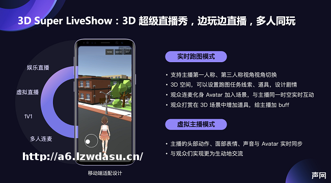 3D ****秀玩法为主播提供了一种创新吸粉方式,也能有效降低内容生产门槛。主播边跑图边**,观众可以连麦化身 Avatar 加入当前 3D 场景,通过**的形式给主播增加道具或 buff,在跑图过程中,主播也可以一键切换为虚拟形象模式,在该玩法中,声网可配合企业按需定制不同风格的虚拟形象(如卡通全身、超写实半身、二次元半身等)和 3D 场景,