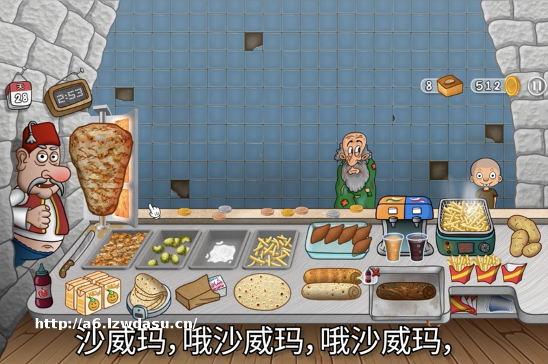 再看《沙威玛传奇》,不仅体量小、画风粗糙;整体的游戏玩法也只是日复一日地做卷饼*钱、升级各种道具,然后继续*钱。