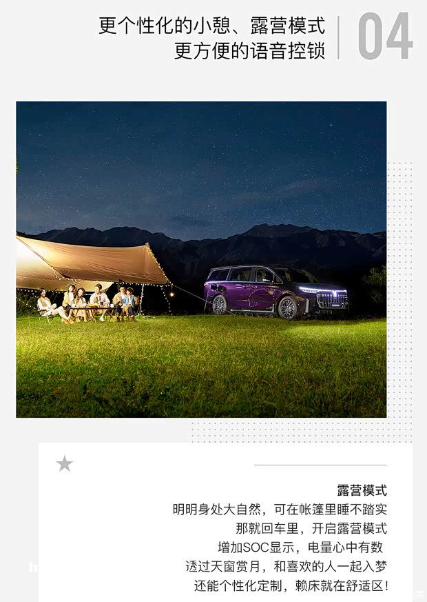 此外,此次还针对小憩、露营两大模式升级。小憩模式下,不必再一一调节座椅、空调、香氛,一键即可让休息环境准备就绪。露营模式方面,岚图FREE新增氛围灯、车窗、熄屏时间、香氛设置项,可指引座椅调节并联动空调、灯光,并支持全车语音闭锁中控,提供舒适安心的座舱环境;岚图梦想家的露营模式则增加SOC显示,让车主对剩余电量心中有数。