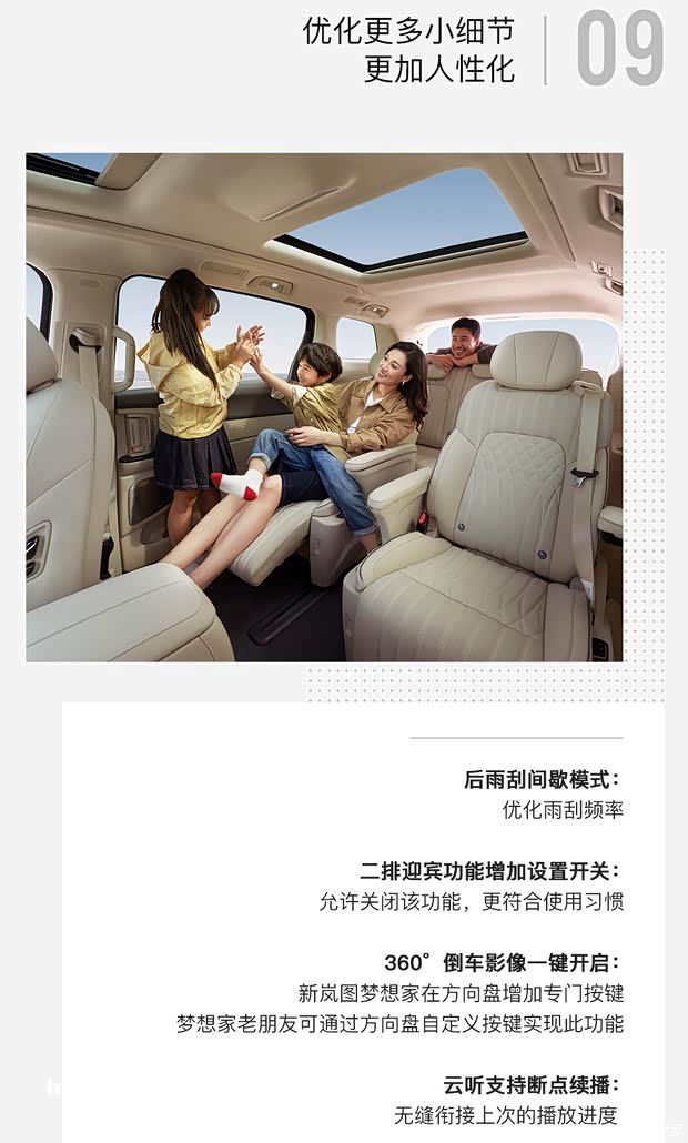 另外,岚图梦想家的云听支持断点续播,无缝衔接上次的播放进度,不必再费时费力查找。此外,OTA 3.0提供更方便的语音控锁,在车内4个位置都能语音解闭中控锁,在后排躺睡时无需移到前排再操作。远距离出行时,二排乘客常常“机不离手”,如果此时感到乏累需要,无需探身寻找按键,升级后的岚图梦想家支持手机调控座椅、空调、灯光,蓝牙信号稳定覆盖全车且支持多台手机同时连接。