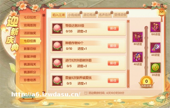 新服前7天,每日依次开放部分任务,累计进度更可获得**装备奖励。