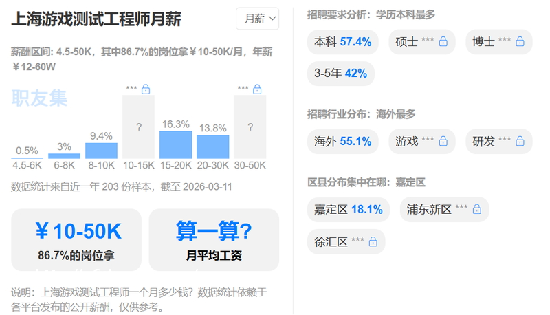 职友集游戏测试工程师岗位中,86.7%的岗位月薪在10-50K之间,换算成年薪,妥妥的12-60W。