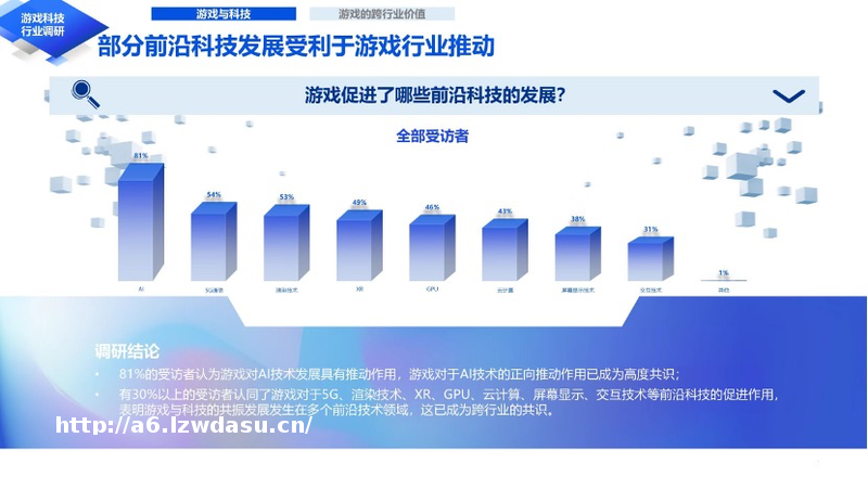过去半年,62% 受访者认可游戏科技对**技术创新能力的作用,81% 的受访者认同游戏促进了 AI 技术的发展,另分别有 54%、49%、46% 与 43% 的受访者认同游戏对 5G、XR、GPU 与云计算技术的发展。整体上,63% 的行业受访者认可「游戏科技」概念;同时,91.4% 的大众调研者认为游戏科技对实体领域有推动作用。