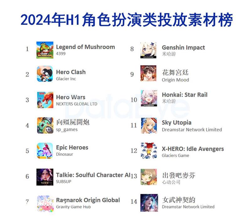 无*有偶,位列百强榜第4的广州4399今年也凭借买量攻势强势突围。2024上半年4399旗下《菇勇者传说》成为同品类的买量冠军(出海领域),位列海外角色扮演类投放素材榜**,以及海外手游素材投放总榜第3。