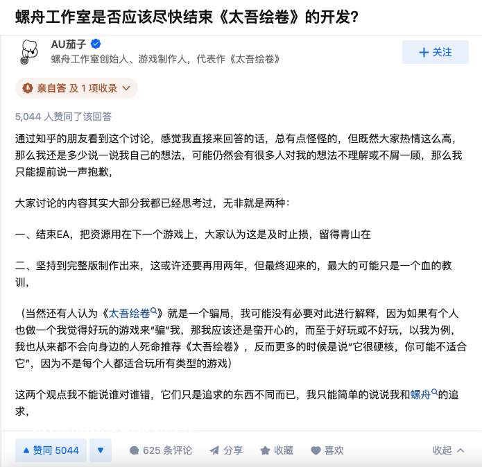 旁人的观点,茄子自己并非不懂。在2020年7月,他就在知乎回复过“螺舟工作室是否应该尽快结束《太吾绘卷》的开发?”的问题,在当时封闭开发的公告刚刚发出。而在读娱君看来,茄子当时的文字其实已经解释了螺舟大方向上的所有选择: