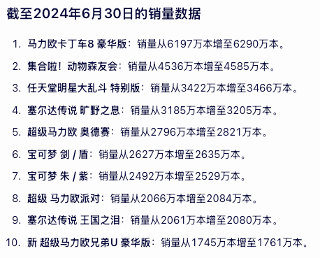 主机游戏玩家偏爱大作,比如马里奥与宝可梦两大IP,以及前文提到的塞尔达和动森,这些IP霸占了Switch历史销量前十的榜单。