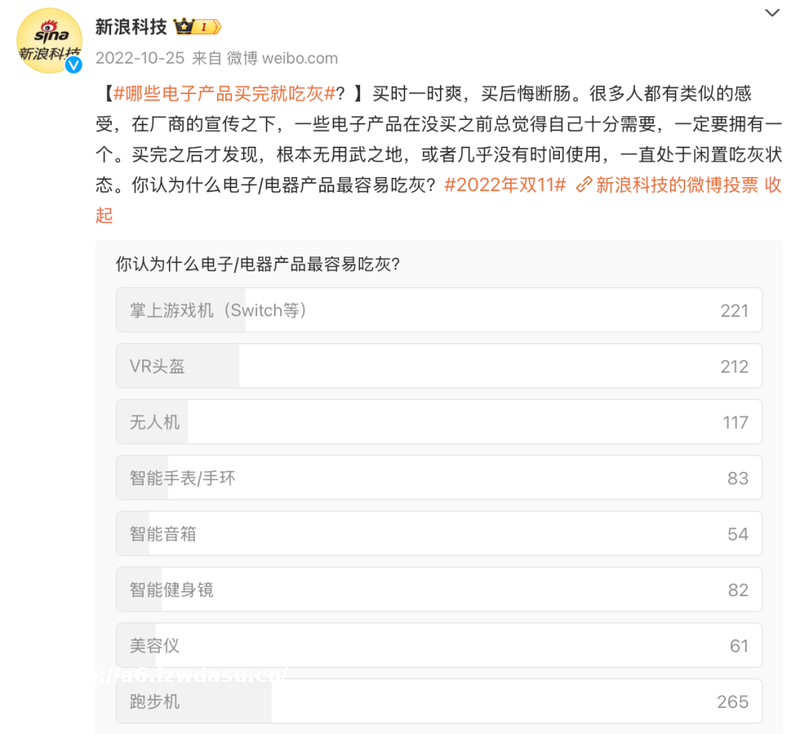 当时,Switch的全球销量已经破亿,半年一次充电提醒被忠实玩家视为“顽梗”和“自嘲”。但新浪的反应很快,迅速推出了一则投票,Switch在“最容易吃灰的电子产品”中排在第二,排在**的跑步机更像是被派来挽尊的。