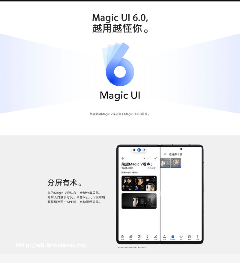 Magic UI 6.0 带来了场景感知、用户理解和知识图谱的 AI 能力升级,在基础 OS 上做到「个*化 OS」,在跨设备 OS 上做到多设备的智能协同。