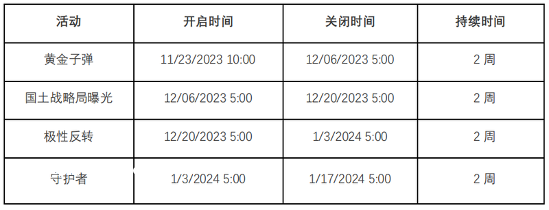 -赛季 1 将会在 11/23/2023 开启对于对抗特工:的猎捕,持续时间为 8 周,期间每 2 周会更新一个找到木星的线索(开启小猎捕),这些线索需要去通关游戏内的一些关卡后获得,当玩家获得了全部线索后,可以在提示的位置找到 NPC-木星,