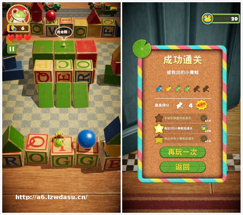 游戏整体玩法类似于之前的一款经典游戏《天天过马路》,你需要操控一只青蛙在布满玩具的房间内向前跳跃抵达终点。你还得留意解救途中被困的**蛙,不被玩具车撞到,而为了解决困难,游戏中还加入了**、垒球等道具,趣味*还算不错。