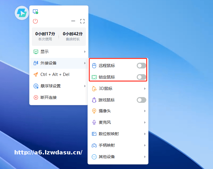 在外接设备上,悬浮球增加了远程鼠标和锁定鼠标功能。远程鼠标可以更加精准定位鼠标的位置,而锁定鼠标可以锁定鼠标移动界面,开启后鼠标将无法跑出云电脑使用范围。