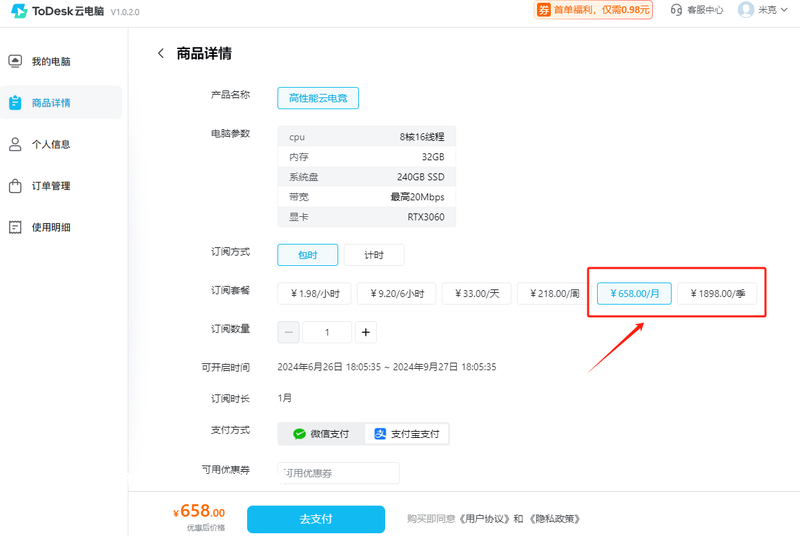 除了计时机功能外,ToDesk云电脑还新增了包时机套餐,提供了包月和包季的订购方式,包月机售价658元,换算下来一小时才九毛钱,而包季机售价1898元,平均一小时也不到八毛钱。如果是有长期使用云电脑需求的用户,选择包月或包季无疑是更优惠的方案。
