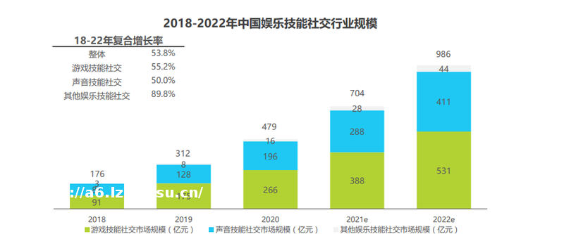 **社交每年的规模都在不断地上升,而且预计在2022年还会继续增加。2020年**技能社交行业规模达到479亿元,占线上**行业总规模的6%,预计在 2018年-2022年里以超过40%的复合增长率持续增长,整体市场规模将在2022年接近1000亿元。从**技能社交行业的细分市场来看,游戏技能社交仍是市场最主要的组成部分,